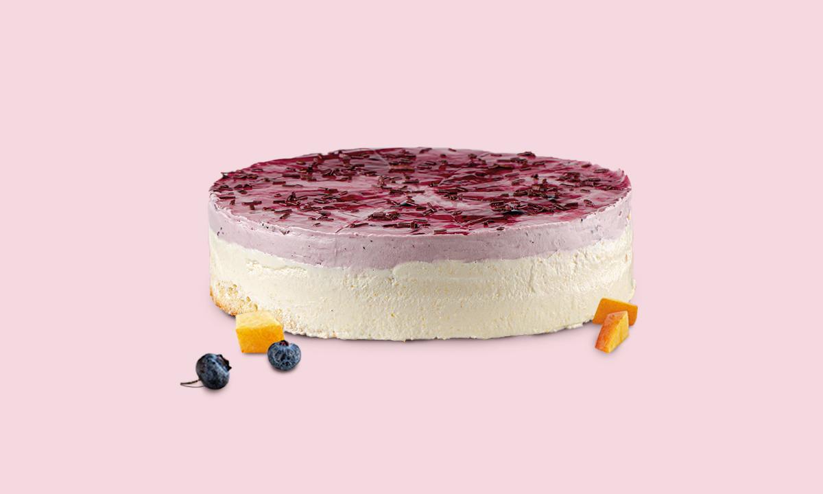 " Vanilla cake, white chocolate mousse, blueberry and peach pieces...”